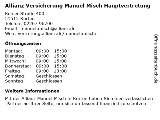2 AXA Versicherung - Hauptvertretung Markus Brombach (Entfernung: 8,22 km) Moitzfeld 50, 51429 Bergisch Gladbach 4 HDI Hauptvertretung Rolf und Judith Baumeister (Entfernung: 11,24 km) Heinrich-Lübke-Straße 9, 51375 Leverkusen 5 Allianz Versicherung Eduard Polanski Hauptvertretung (Entfernung: 11,42 km) Kölner Straße 10, 42929 Wermelskirchen 6 Lohn- und Einkommensteuer Hilfe-Ring Deutschland e.V. - Manuel Veith (Entfernung: 11,43 km) Bergisch-Gladbacher-Str. 1062, 51069 Köln-Dellbrück |