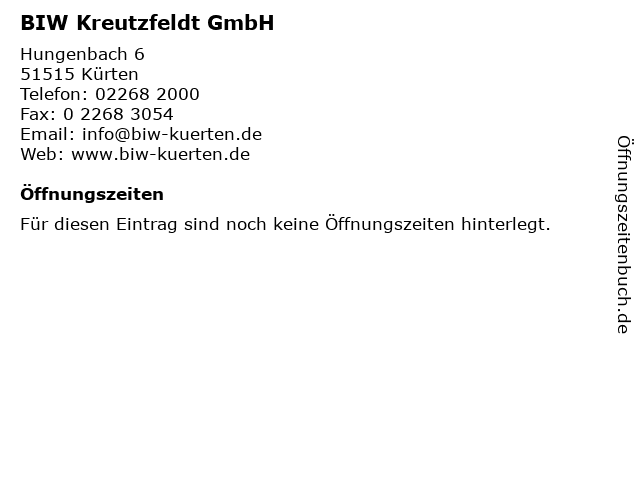 | Öffnungszeiten BIW Kreutzfeldt GmbH in Kürten anzeigen | |