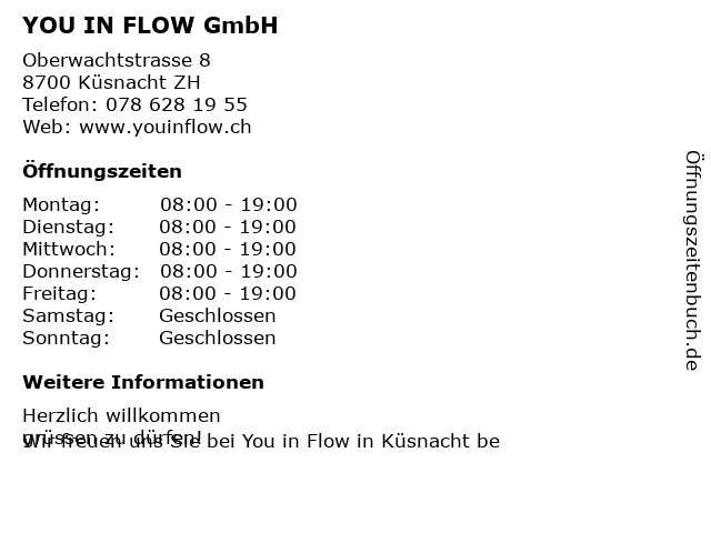 | Öffnungszeiten YOU IN FLOW GmbH in Küsnacht ZH anzeigen | |