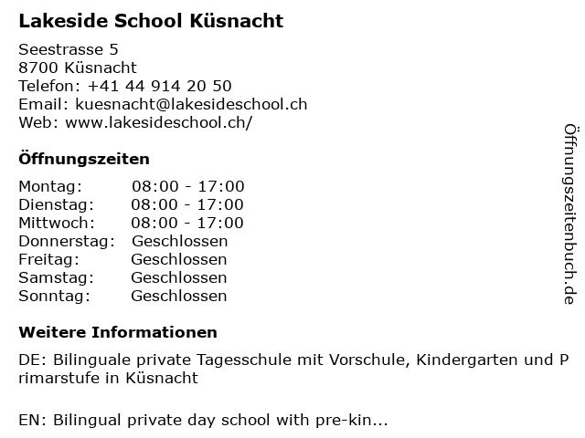 | Öffnungszeiten Lakeside School Küsnacht in Küsnacht anzeigen | |