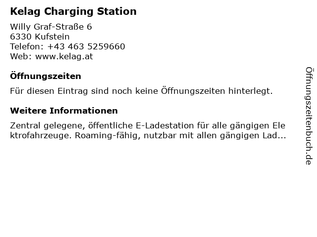 | Öffnungszeiten Kelag Charging Station in Kufstein anzeigen | |
