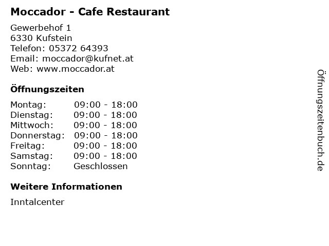 | Öffnungszeiten Moccador - Cafe Restaurant in Kufstein anzeigen | |
