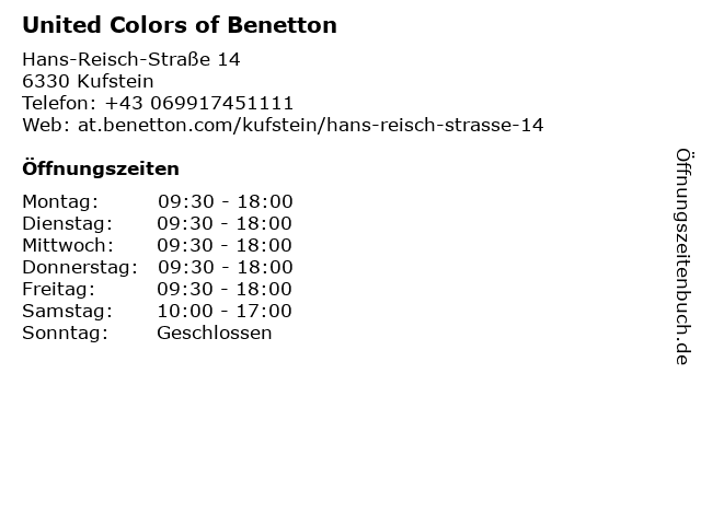 | Öffnungszeiten United Colors of Benetton in Kufstein anzeigen | |