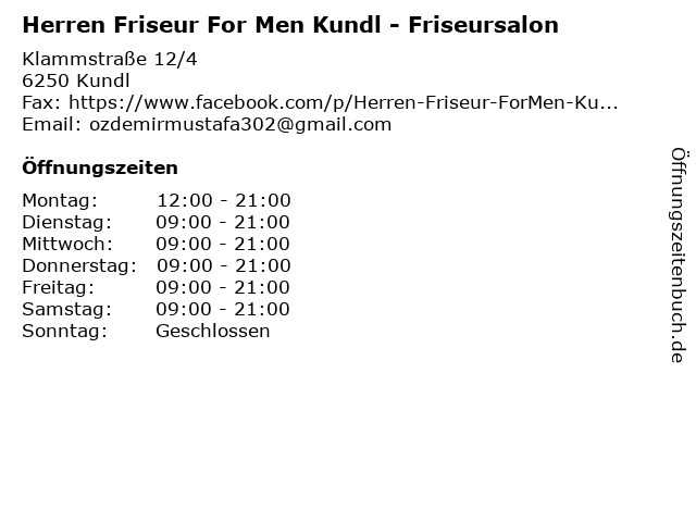 | Öffnungszeiten Herren Friseur For Men Kundl - Friseursalon in Kundl anzeigen | |