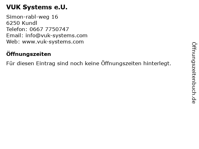 | Öffnungszeiten VUK Systems e.U. in Kundl anzeigen | |
