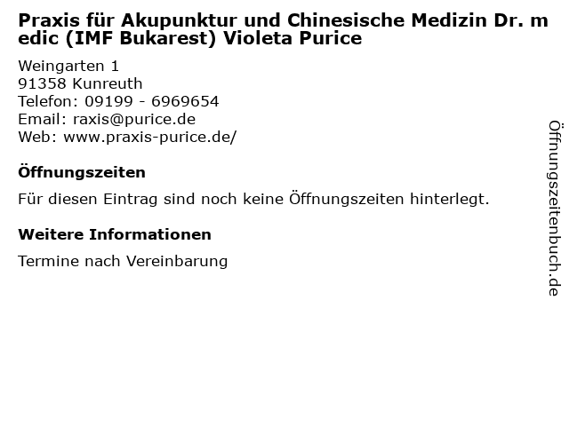 | Praxis für Akupunktur und Chinesische Medizin Dr. medic (IMF Bukarest) Violeta Purice anrufen | |
