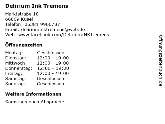 | Öffnungszeiten Delirium Ink Tremens in Kusel anzeigen | |