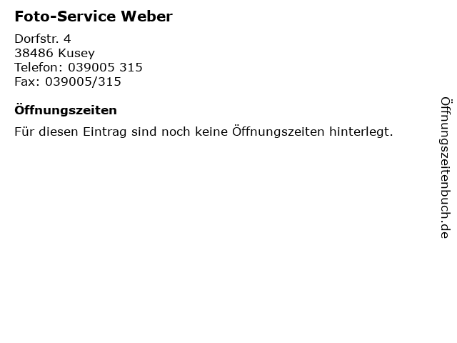 | Öffnungszeiten Foto-Service Weber in Kusey anzeigen | |