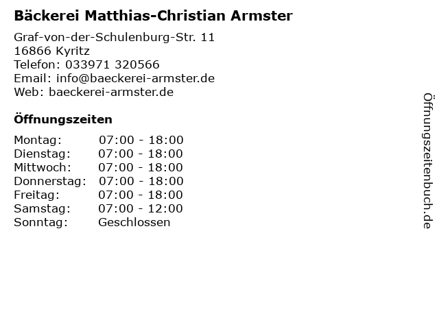 1 Bäckerei Matthias-Christian Armster (Entfernung: 0,33 km) Johann-Sebastian-Bach-Str. 25, 16866 Kyritz 6 |