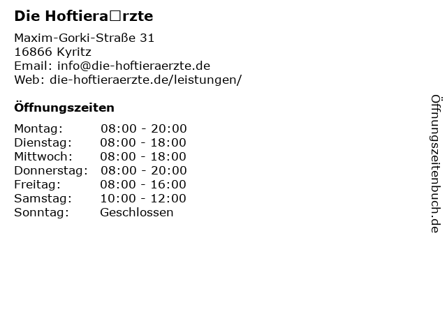 | Öffnungszeiten Die Hoftierärzte in Kyritz anzeigen | |