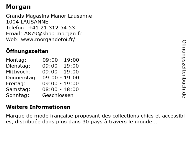 | Öffnungszeiten Morgan in LAUSANNE anzeigen | |