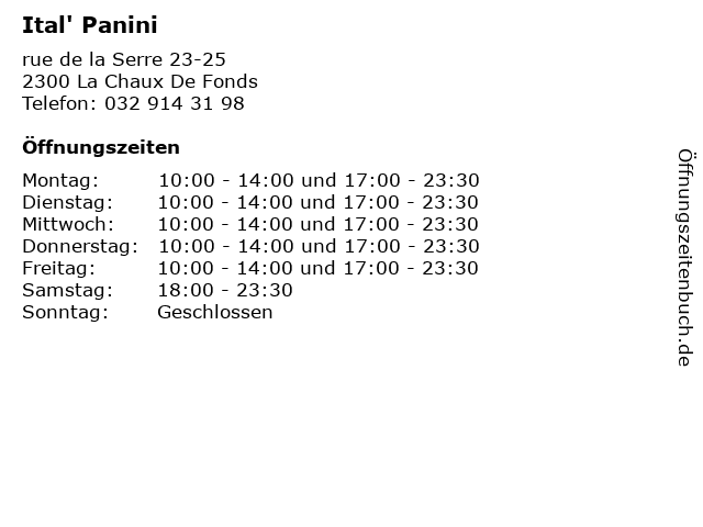 | Öffnungszeiten Ital' Panini in La Chaux De Fonds anzeigen | |