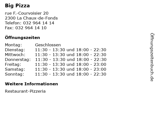 | Öffnungszeiten Big Pizza in La Chaux-de-Fonds anzeigen | |