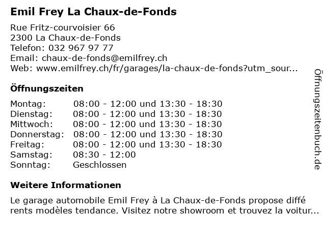 1 Emil Frey SA, Centre Automobile - Verkauf (Entfernung: 0,01 km) Rue Fritz-Courvoisier 66, 2302 La Chaux-de-Fonds 2 Emil Frey SA, Centre Automobile - Werkstatt (Entfernung: 0,01 km) Rue Fritz-Courvoisier 66, 2302 La Chaux-de-Fonds 6 |