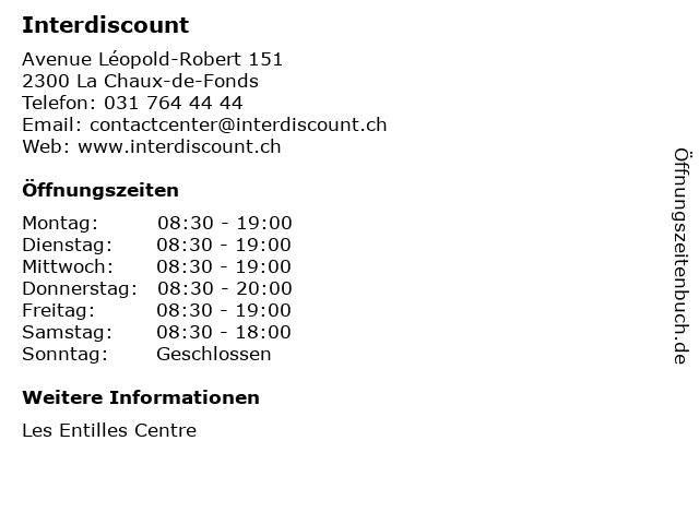 | Öffnungszeiten Interdiscount in La Chaux-de-Fonds anzeigen | |