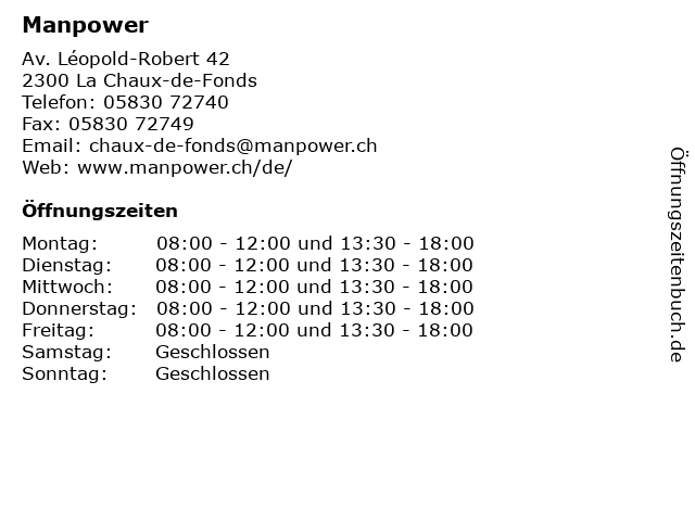 | Öffnungszeiten Manpower in La Chaux-de-Fonds anzeigen | |