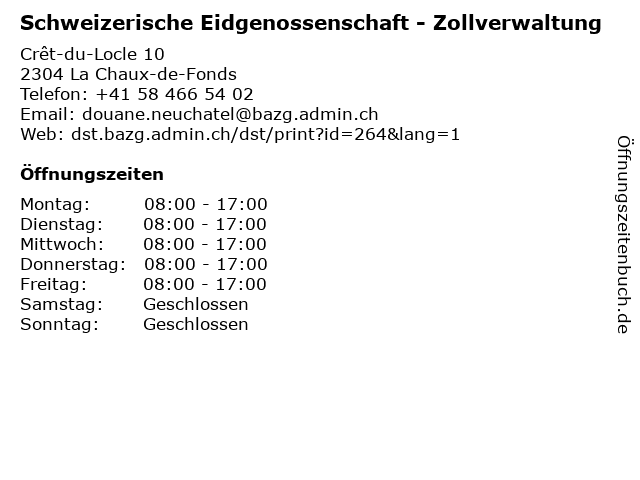 2 Schweizerische Eidgenossenschaft - Zollverwaltung (Entfernung: 14,42 km) Point d'appui ferroviaire 1, 2000 Neuchâtel 3 Die Schweizerische Post AG - Geschäftskundenstelle (Entfernung: 1,15 km) Allée des Défricheurs 1, 2300 La Chaux-de-Fonds 6 Eidgenössische Zollverwaltung EZV - Bureau cantonal des métaux précieux (Veranlagungszeiten Handelswaren) (Entfernung: 3,52 km) Avenue Léopold-Robert 67, 2300 La Chaux-de-Fonds |