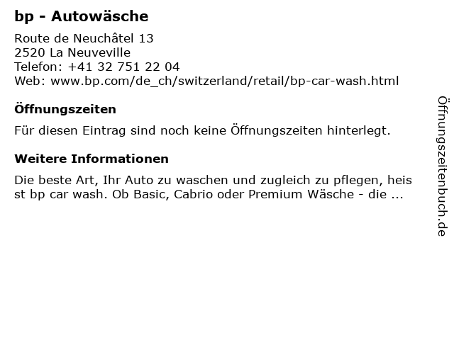 Öffnungszeiten bp - Autowäsche in La Neuveville anzeigen | |