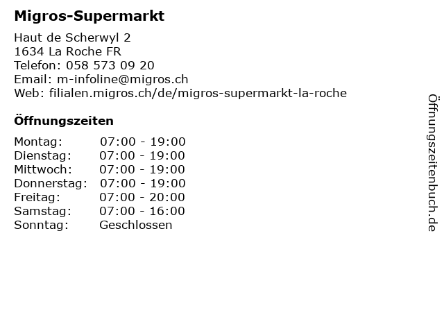 | Öffnungszeiten Migros-Supermarkt in La Roche FR anzeigen | |