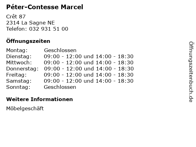 | Öffnungszeiten Péter-Contesse Marcel in La Sagne NE anzeigen | |