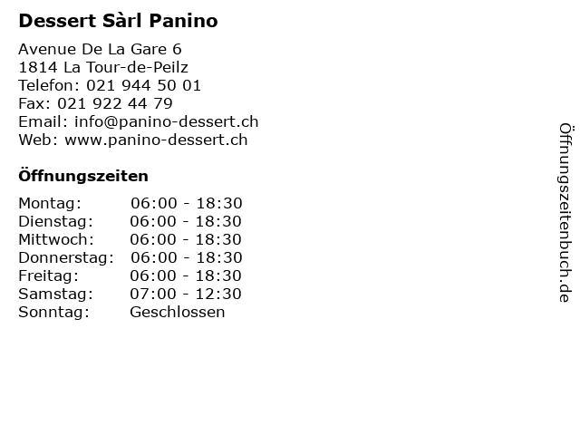| Öffnungszeiten Dessert Sàrl Panino in La Tour-de-Peilz anzeigen | |