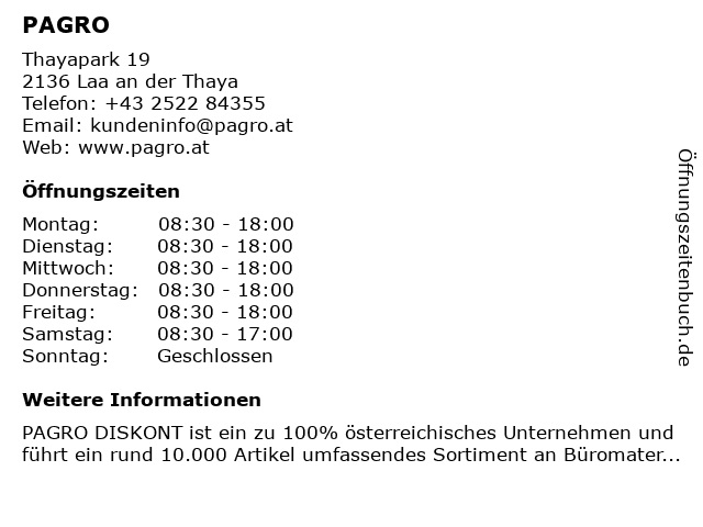 | Öffnungszeiten PAGRO in Laa an der Thaya anzeigen | |