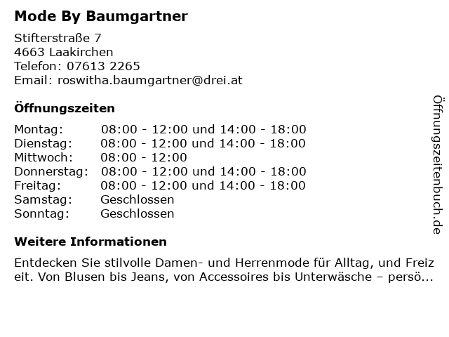 | Öffnungszeiten Mode By Baumgartner in Laakirchen anzeigen | |