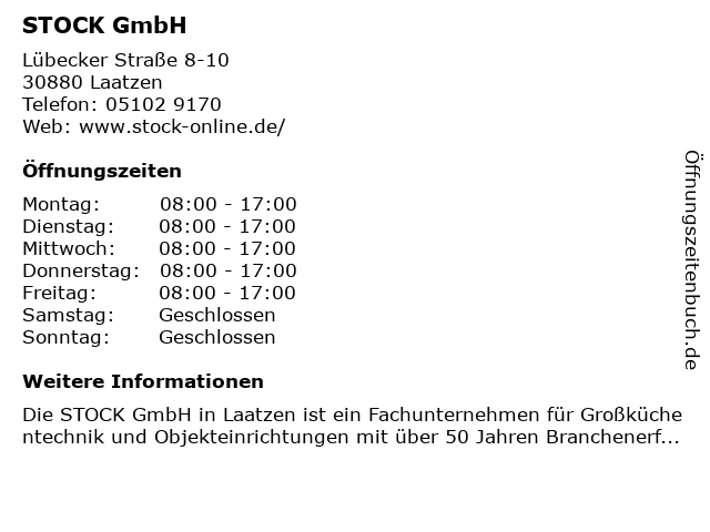 | Öffnungszeiten STOCK GmbH in Laatzen anzeigen | |