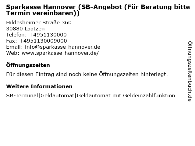 Sparkasse Hannover (SB-Center) in Laatzen: Telefonnummer, Öffnungszeiten und Adresse