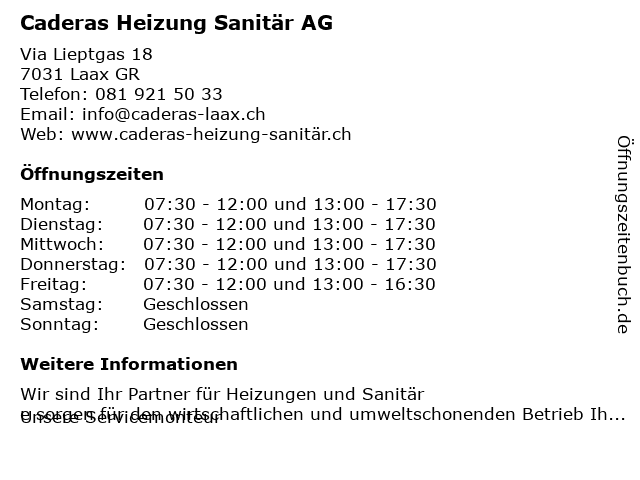 | Öffnungszeiten Caderas Heizung Sanitär AG in Laax GR anzeigen | |