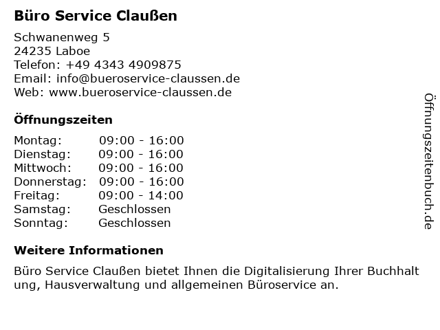 | Öffnungszeiten Büro Service Claußen in Laboe anzeigen | |