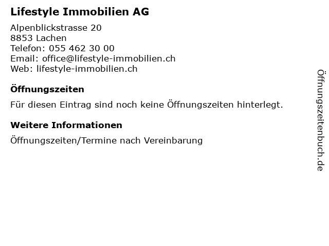| Öffnungszeiten Lifestyle Immobilien AG in Lachen anzeigen | |