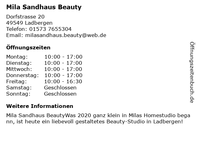 | Öffnungszeiten Mila Sandhaus Beauty in Ladbergen anzeigen | |