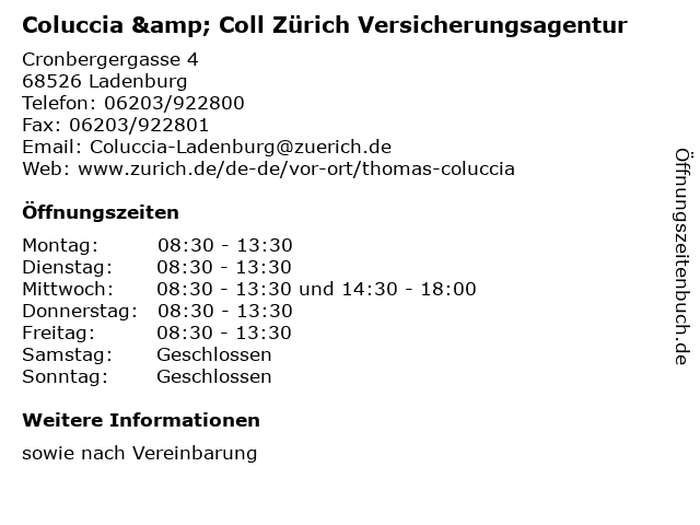 1 Coluccia & Coll Zürich Versicherungsagentur (Entfernung: 8,84 km) Duisburger Straße 13, 68723 Schwetzingen 2 Michael Behringer Zurich Versicherungsagentur (Entfernung: 0,00 km) Cronbergergasse 4, 68526 Ladenburg 3 Allianz Generalagentur Hannelore Liptor Versicherungsagentur (Entfernung: 0,91 km) Hauptstraße 424, 68535 Edingen 4 LVM Versicherung Jürgen Meisel - Versicherungsagentur (Entfernung: 2,65 km) Hauptstraße 109, 68535 Edingen-Neckarhausen 6 LVM Versicherung Dirk Schniebs - Versicherungsagentur (Entfernung: 3,70 km) Unterdorfstraße 36, 68542 Heddesheim |