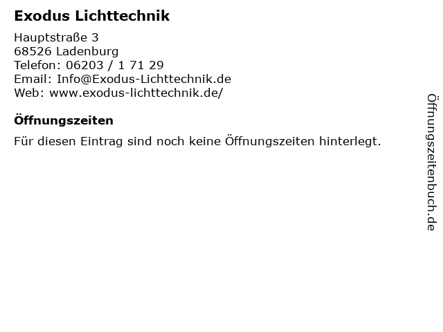 | Öffnungszeiten Exodus Lichttechnik in Ladenburg anzeigen | |