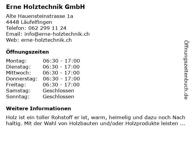 | Öffnungszeiten Erne Holztechnik GmbH in Läufelfingen anzeigen | |