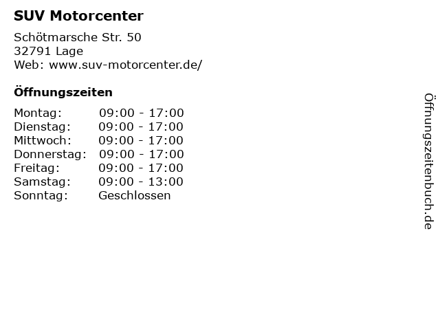 | Öffnungszeiten SUV Motorcenter in Lage anzeigen | |