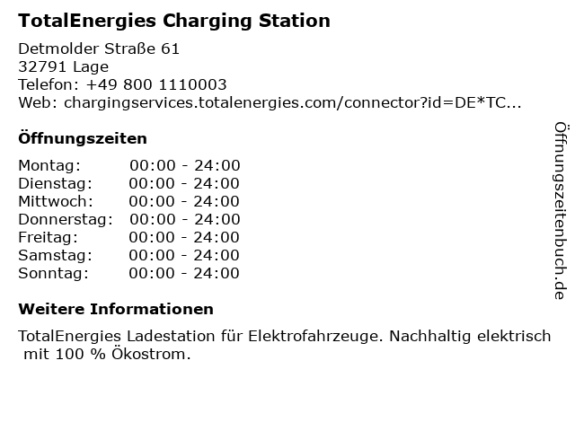 | Öffnungszeiten TotalEnergies Charging Station in Lage anzeigen | |