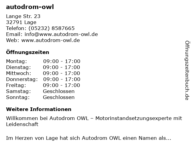 Öffnungszeiten autodrom-owl in Lage anzeigen | |