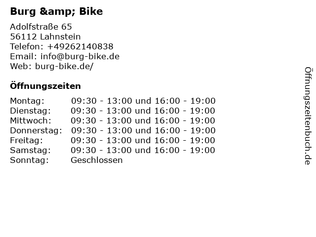 | Öffnungszeiten Burg & Bike in Lahnstein anzeigen | |
