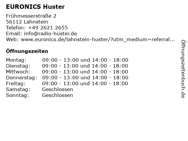 | Öffnungszeiten EURONICS Huster in Lahnstein anzeigen | |