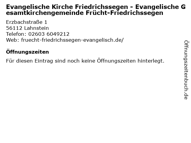 | Evangelische Kirche Friedrichssegen - Evangelische Gesamtkirchengemeinde Frücht-Friedrichssegen anrufen | |