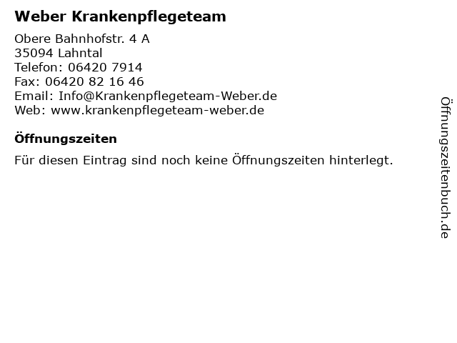 | Öffnungszeiten Weber Krankenpflegeteam in Lahntal anzeigen | |