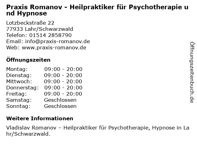 Branchen & Suchbegriffe zu Praxis Romanov - Heilpraktiker für Psychotherapie und Hypnose:heilpraktiker, hypnose, hypnosetherapie, praxis, psychotherapie, romanov |