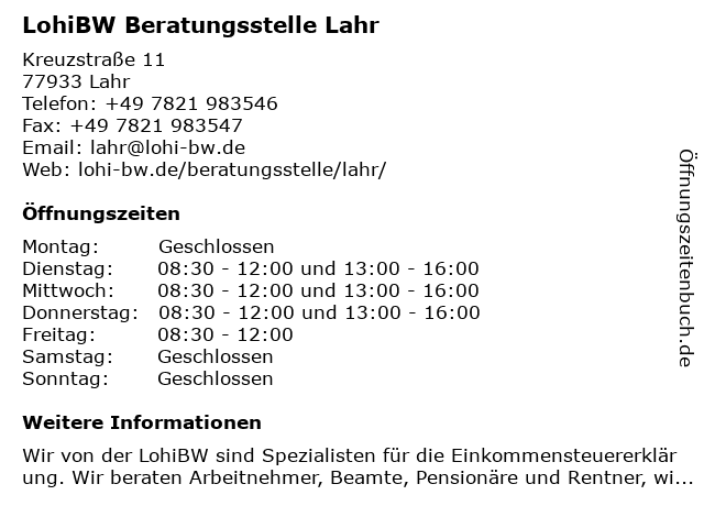 | Öffnungszeiten LohiBW Beratungsstelle Lahr in Lahr anzeigen | |