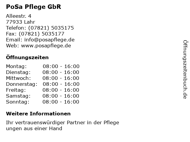 | Öffnungszeiten PoSa Pflege GbR in Lahr anzeigen | |