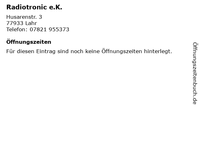 | Öffnungszeiten Radiotronic e.K. in Lahr anzeigen | |