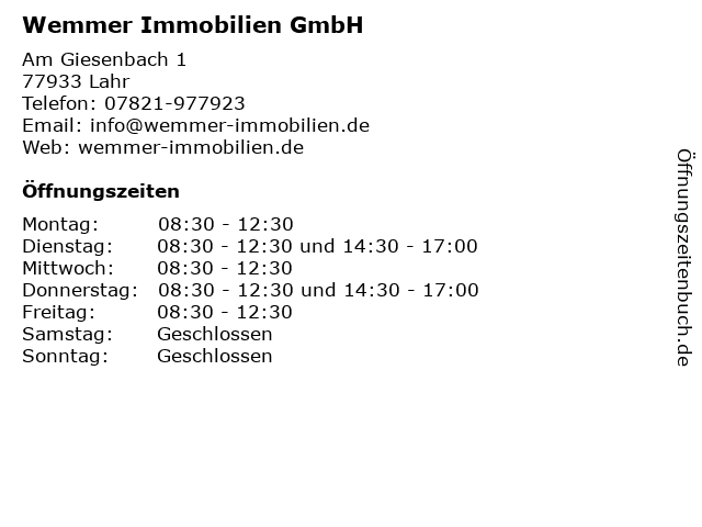 | Öffnungszeiten Wemmer Immobilien GmbH in Lahr anzeigen | |