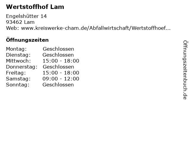 | Öffnungszeiten Wertstoffhof Lam in Lam anzeigen | |