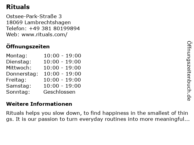 | Öffnungszeiten Rituals in Lambrechtshagen anzeigen | |
